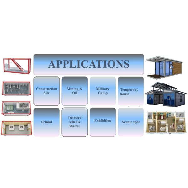 | Advantages of container house | Functional and Comfortable | Fully equipped with kitchen, bathroom, electrical and plumbing systems. Full options to meet living or working usage. |